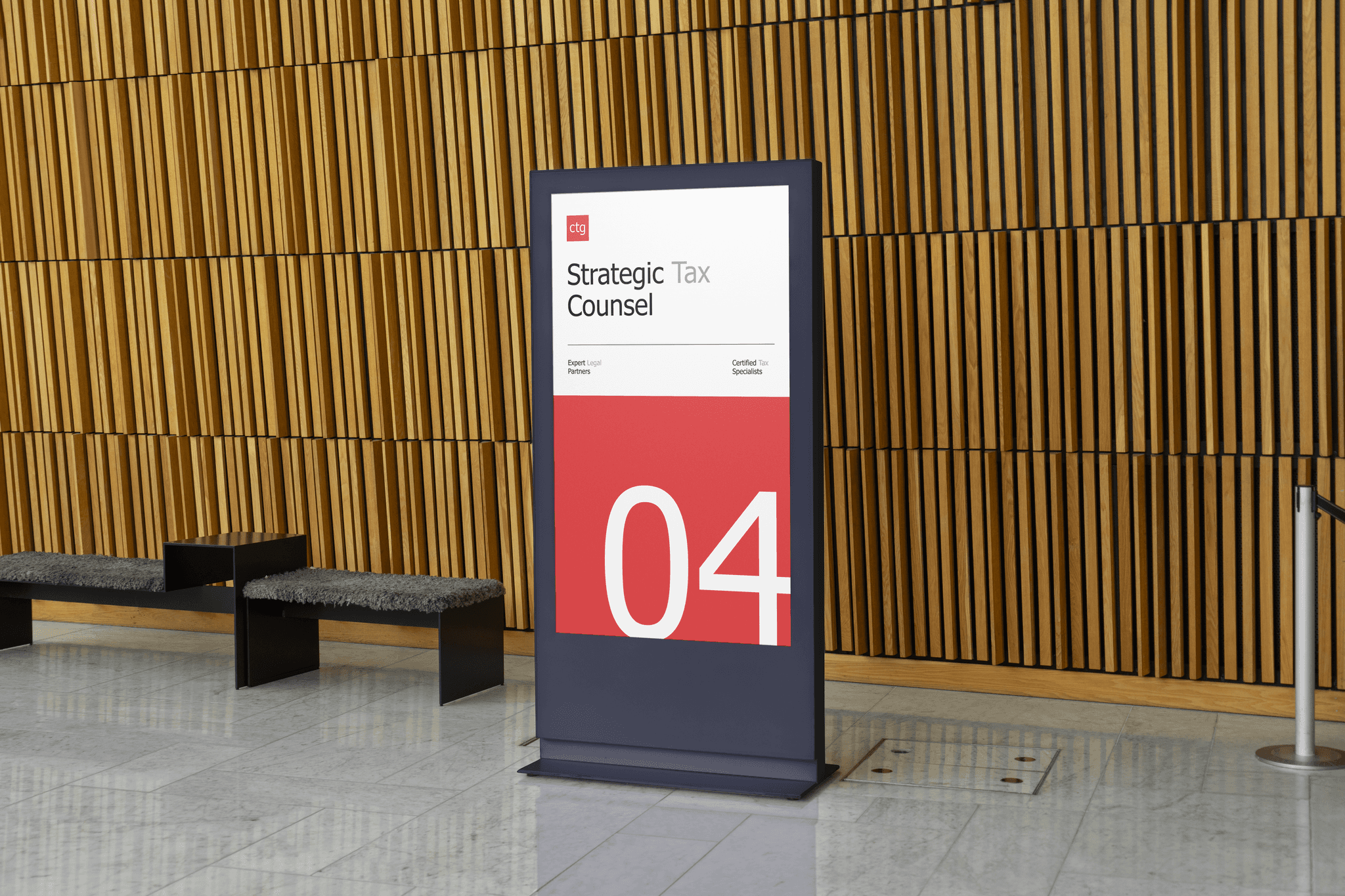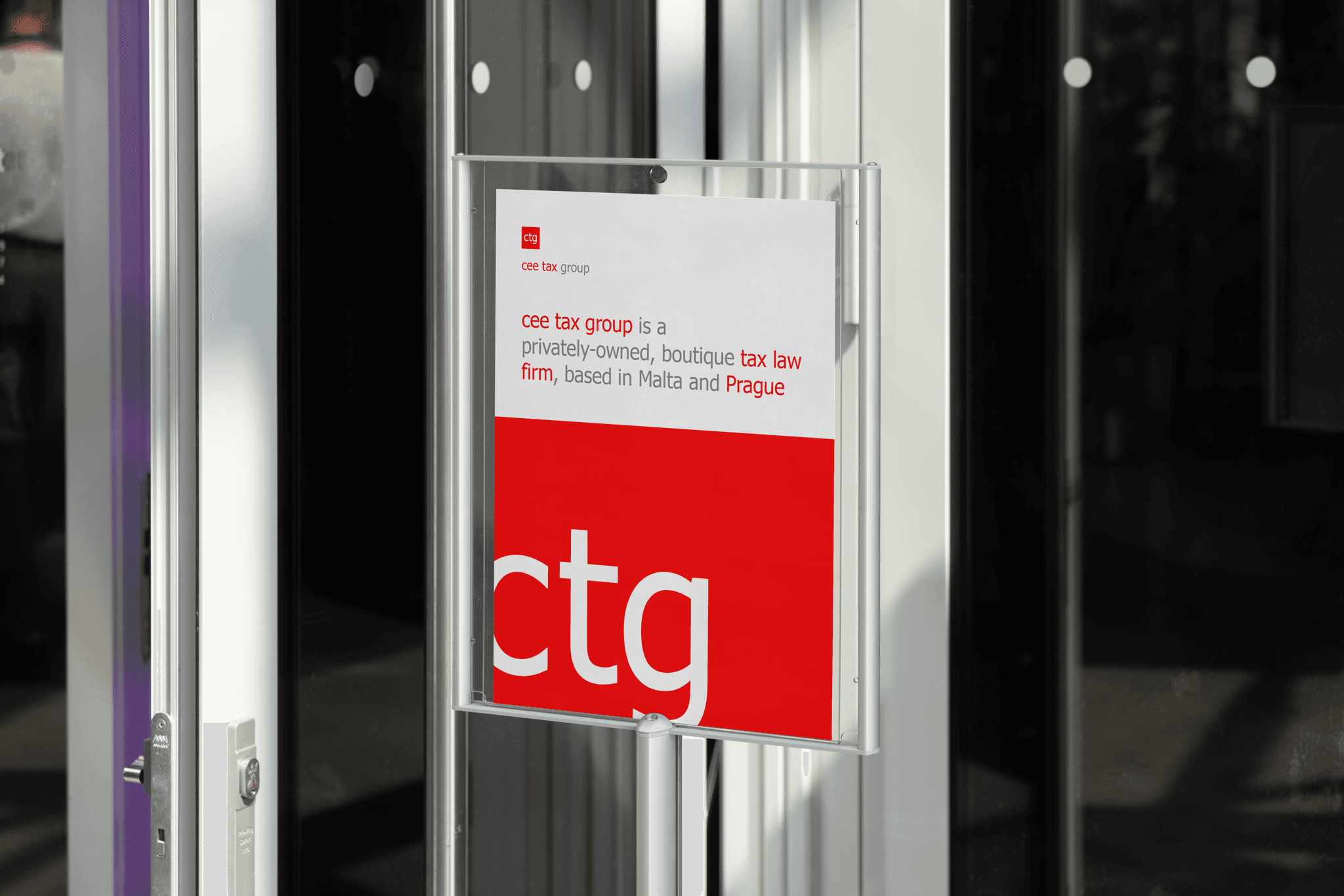 The "ctg" monogram became the hero, bold, geometric, built to own any surface it appears on. The palette is unapologetically red and white: the red carries two decades of deal closing authority, the white gives it the clarity of a firm that never overcomplicates. The typographic system is editorial and structured, referencing financial documents and legal precision without feeling stiff. Applied across signage, business cards, environmental graphics, and print, the system works because it never tries too hard. It simply looks like it belongs at the table it has always been sitting at.